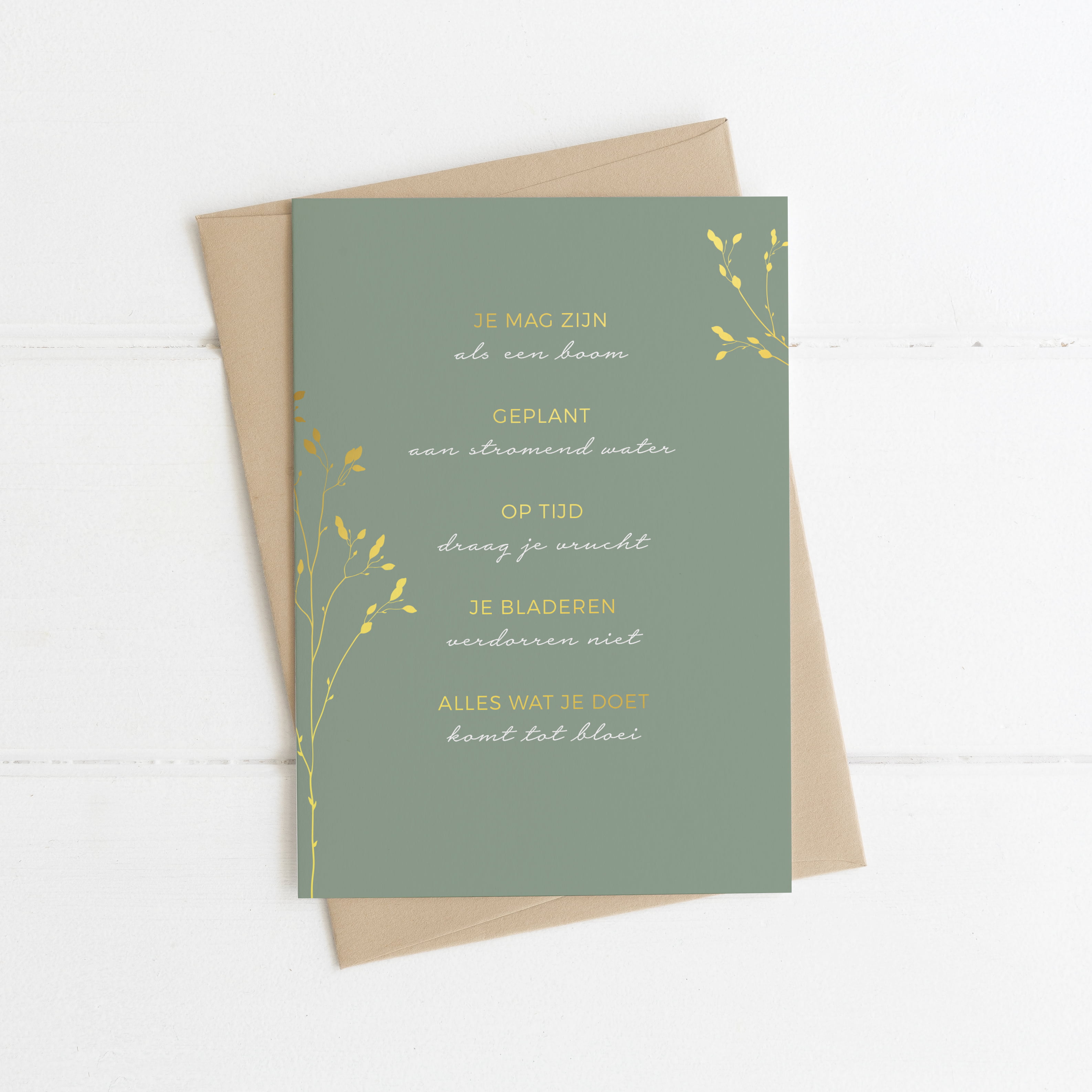 A6 kaart met de tekst: ‘Je mag zijn als een boom, geplant aan stromend water. Op tijd draag je vrucht, je bladeren verdorren niet. Alles wat je doet komt tot bloei.’